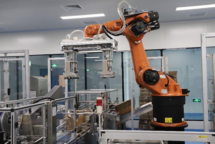 該車間的智能化生產(chǎn)線采用聯(lián)動線設(shè)備和機器人系統(tǒng)能夠自動完成藥瓶燈檢、灌裝、貼簽、裝盒、封箱等一系列從前需要手工執(zhí)行的操作。外壁清洗機自動清除玻璃藥瓶外壁殘留的微量藥粉,便于貼簽的同時保護了生產(chǎn)線工人及醫(yī)院藥房藥師的安全,也是企業(yè)領(lǐng)先于國內(nèi)同行的關(guān)鍵所在。