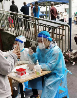 “臨時通知,希望大家理解!”11月15日,秦鵬巍扯著嗓子無數(shù)次地重復(fù)這句話,顯然,今天的工作讓他感到有些焦急。由于當(dāng)天的核酸是臨時通知的,三人成虎,“懼陽”的恐慌情緒在居民之間蔓延開來。秦鵬巍穿上隔離衣,戴上膠手套,用酒精全身消毒后,開始在搭建的臨時核酸點組織居民排隊核酸。正常情況下,秦鵬巍每天平均掃碼700余人,今天聚集人數(shù)逐漸增多,任務(wù)更加繁重。他一邊要幫老年人調(diào)出核酸碼,一邊要安撫居民情緒,一邊還要錄入核酸信息,大顆大顆的汗水干擾著他的視線,饑餓感也伴隨來臨。但穿上“大白戰(zhàn)衣”,便意味著責(zé)任與使命,一定要保持微笑、熱情與耐心。他說:“我要求自己,不能有一絲的不耐煩,必須耐心的向居民解釋,我的言談舉止關(guān)系著西南藥業(yè)的形象。”