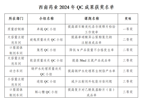 為深入學(xué)習(xí)貫徹黨的二十大精神和習(xí)近平總書記關(guān)于質(zhì)量提升重要論述精神,推動(dòng)質(zhì)量強(qiáng)國(guó)建設(shè),進(jìn)一步激發(fā)員工參與質(zhì)量改進(jìn)的積極性,提高全員質(zhì)量意識(shí)。近日,西南藥業(yè)2024年QC成果發(fā)表會(huì)在公司第三會(huì)議室隆重舉行。公司常務(wù)副總經(jīng)理蔣猛和副總經(jīng)理黃世瓊出席會(huì)議并擔(dān)任評(píng)委,各部室、車間負(fù)責(zé)人、QC小組活動(dòng)相關(guān)人員、質(zhì)量管理人員、班組長(zhǎng)及QC小組活動(dòng)積極分子等近100人參加會(huì)議。